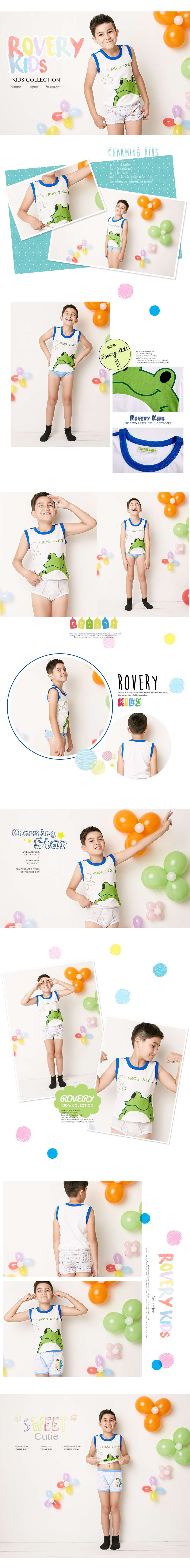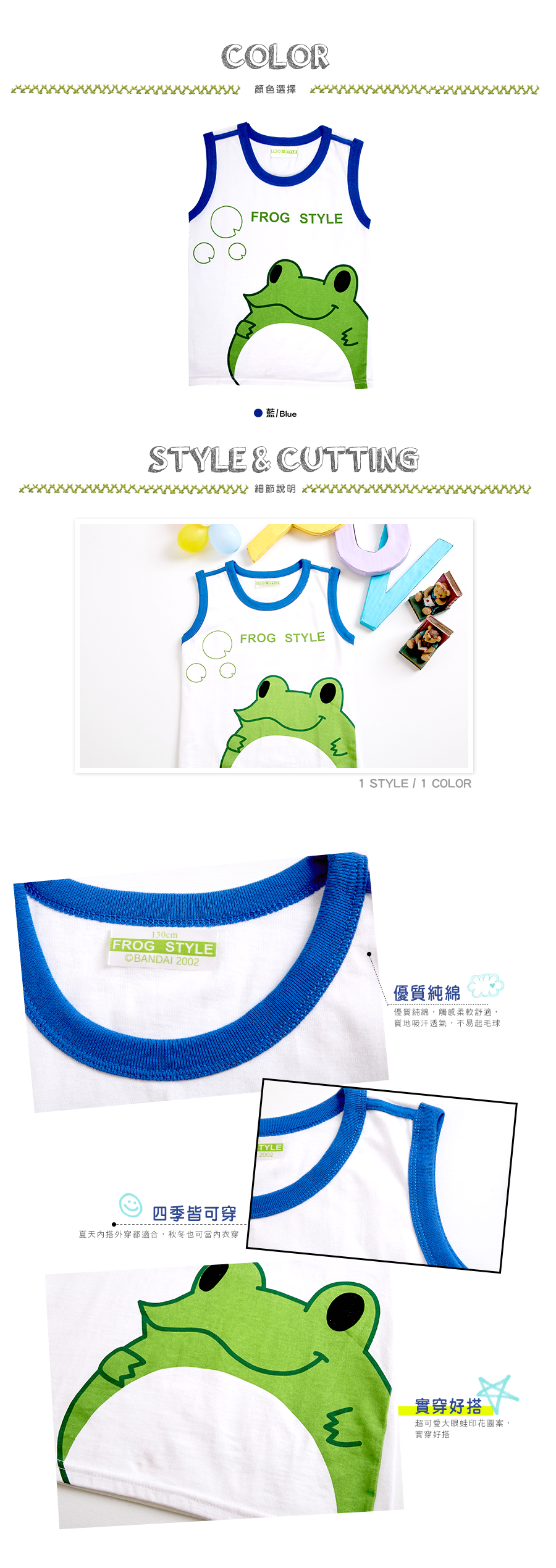 大眼綠蛙。寬肩男童內著背心