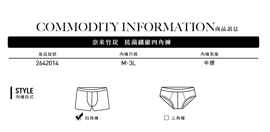 奈米竹炭。抗菌纖維平口褲